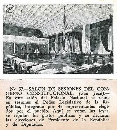 ”El sillón del presidente está sólidamente dorado y tiene cojines de terciopelo carmesí. Encima hay un dosel de raso, también carmesí, y un poco más arriba aparece el escudo de armas de Costa Rica bordado con hilo de oro y plata en terciopelo color púrpura”.