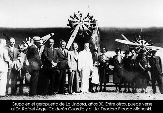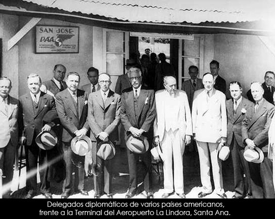 Fue en Lindora, Santa Ana, donde se ubicó el primer aeropuerto del país, que abrió sus puertas en 1931. A la inauguración de tan importante obra asistió don Cleto González Víquez (cuarto de izquierda a derecha), a quien vemos en la imagen en compañía de Wilburgh Morrison, Vice Presidente de Pan American Airways, que realizaba vuelos internacionales.