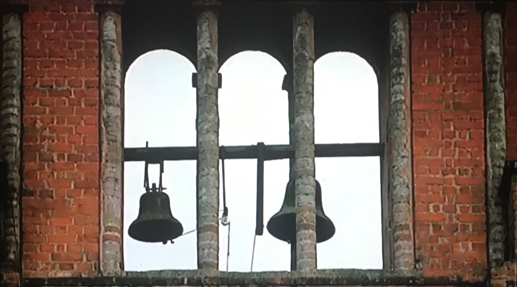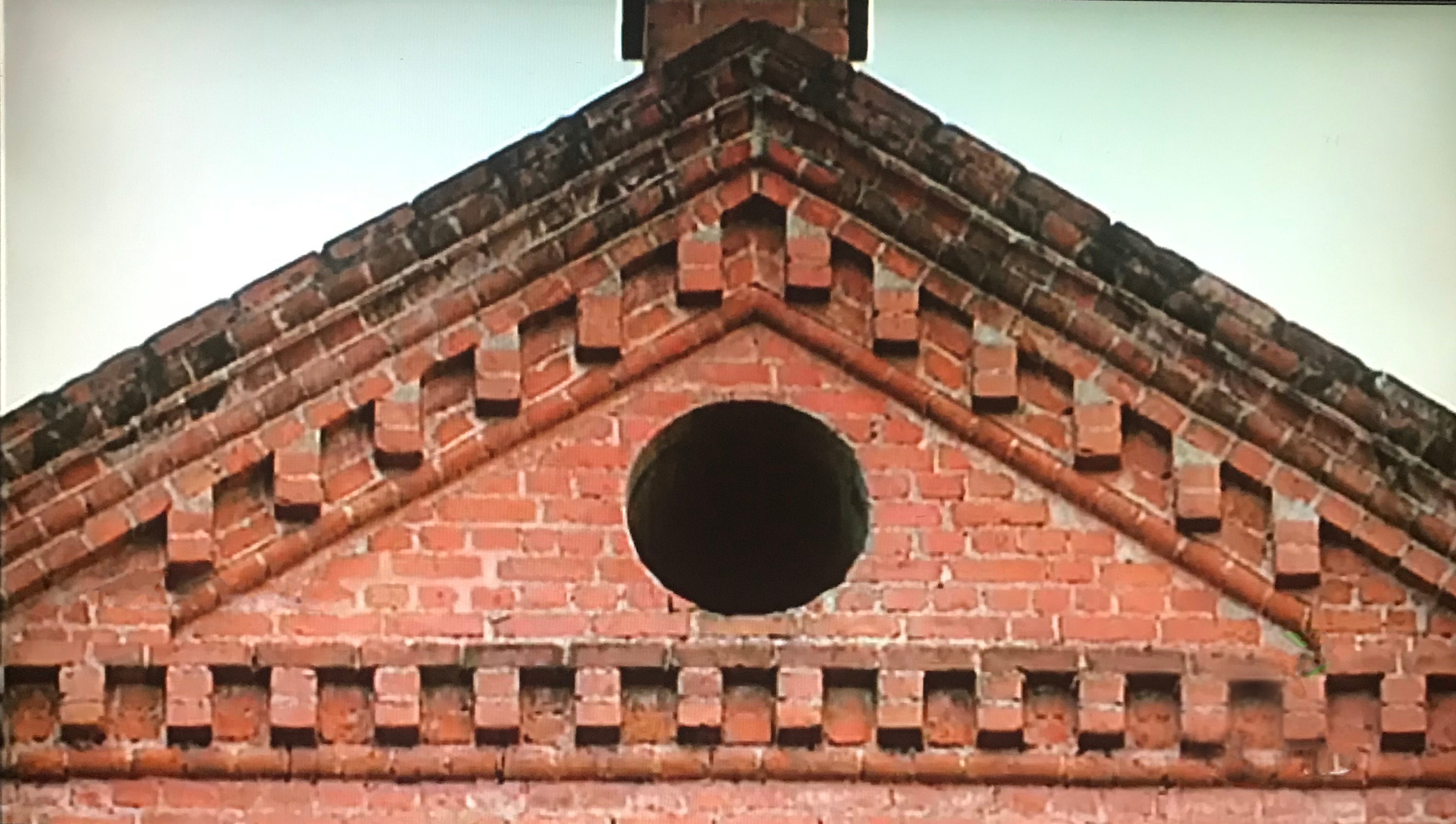 En un segundo plano, un paño rectangular soporta un frontón truncado, el cual, a su vez, sustenta y luce orgulloso una prominente espadaña a tres vanos, que en los extremos hacen repicar dos campanas.