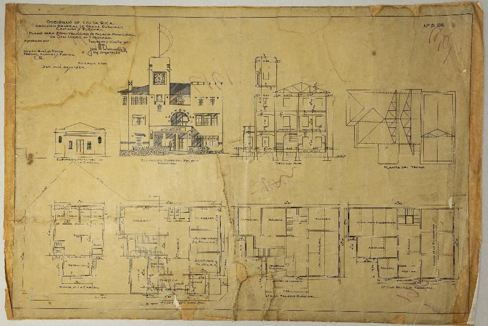 Plano para construcción del Palacio Municipal en San Isidro de Coronado. Provincia de San José. Procede del Ministerio de Obras Públicas. Escala 1:100. Ing. José Ma. Barrantes.