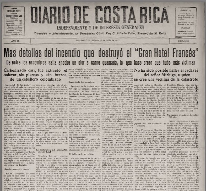 Noticia del incendio que destruyó el Gran Hotel Francés, Diario de C.R., 22 de julio de 1927.