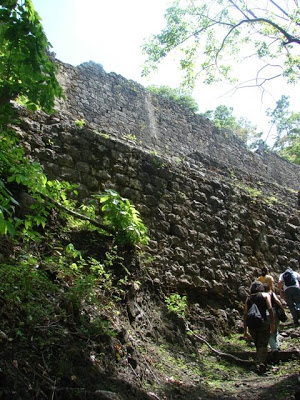 Al subir a la parte alta, se ven majestuosas las ruinas de piedra labrada de los cimientos del antiguo Edificio de los Mazos, que molieran 100 toneladas de material aurífero cada día durante los 30 años que durara la explotación minera. Semejan ruinas arqueológicas indígenas imponentes.