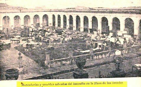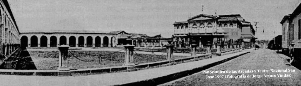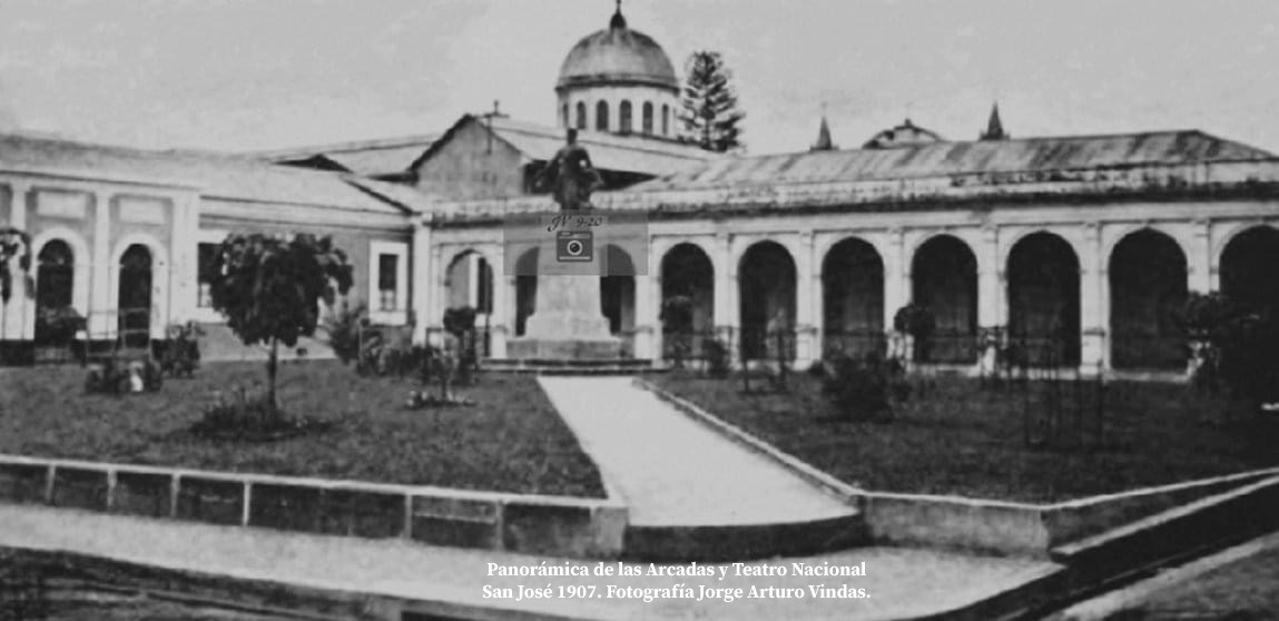 En 1913, un incendio destruye la mayoría de la manzana al oeste del Teatro Nacional, incluidos los locales aledaños a las Arcadas. Eso obliga a la renovación del sector (edificios del Banco Anglo Costarricense, Edificio Juan Khnör y Pasaje Central, a la izquierda), pero deja desocupado el solar al norte de la Plaza Juan Mora Fernández.
