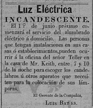 17 de diciembre de 1892: Se introduce el alumbrado incandescente y se modifica el contrato de julio de 1891, a cargo de la Empresa de Luz Eléctrica.