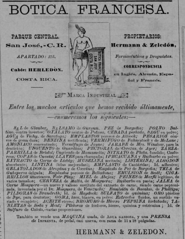 Los propietarios de la Botica Francesa fueron Hermann y Zeledón, farmacéuticos.