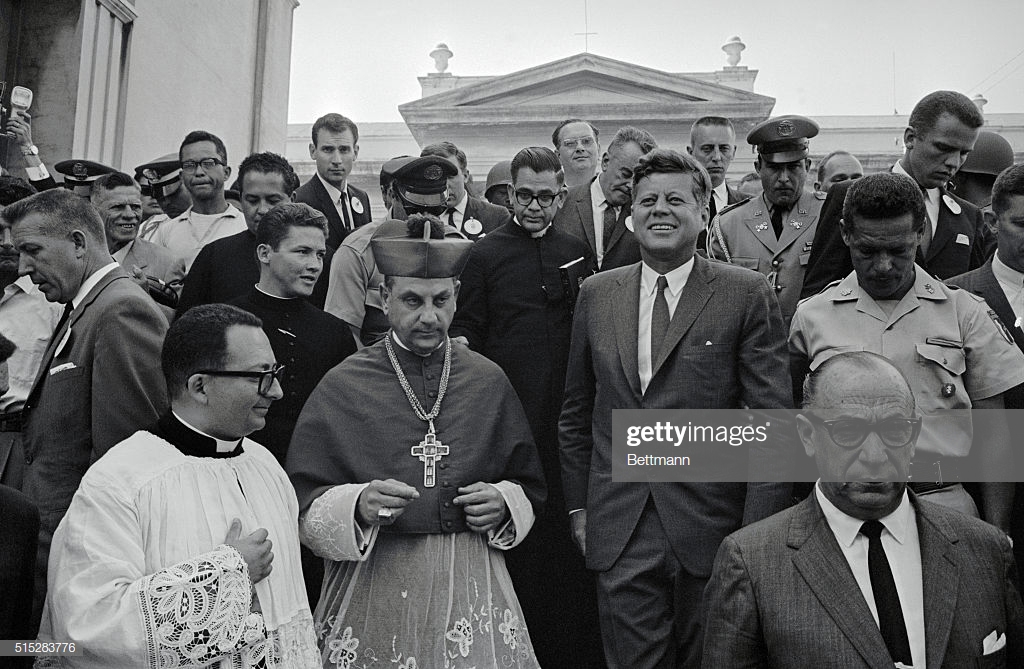 President Kennedy leaves a historic cathedral after attending Mass on St. Joseph’s Day, a national holiday in Costa Rica. His next appointment for the day is a meeting with presidents from several Central American nations. Accompanying Kennedy are Costa Rican President Francisco Orlich (right) and Archbishop Carlos Umberto Rodriguez Quiros.