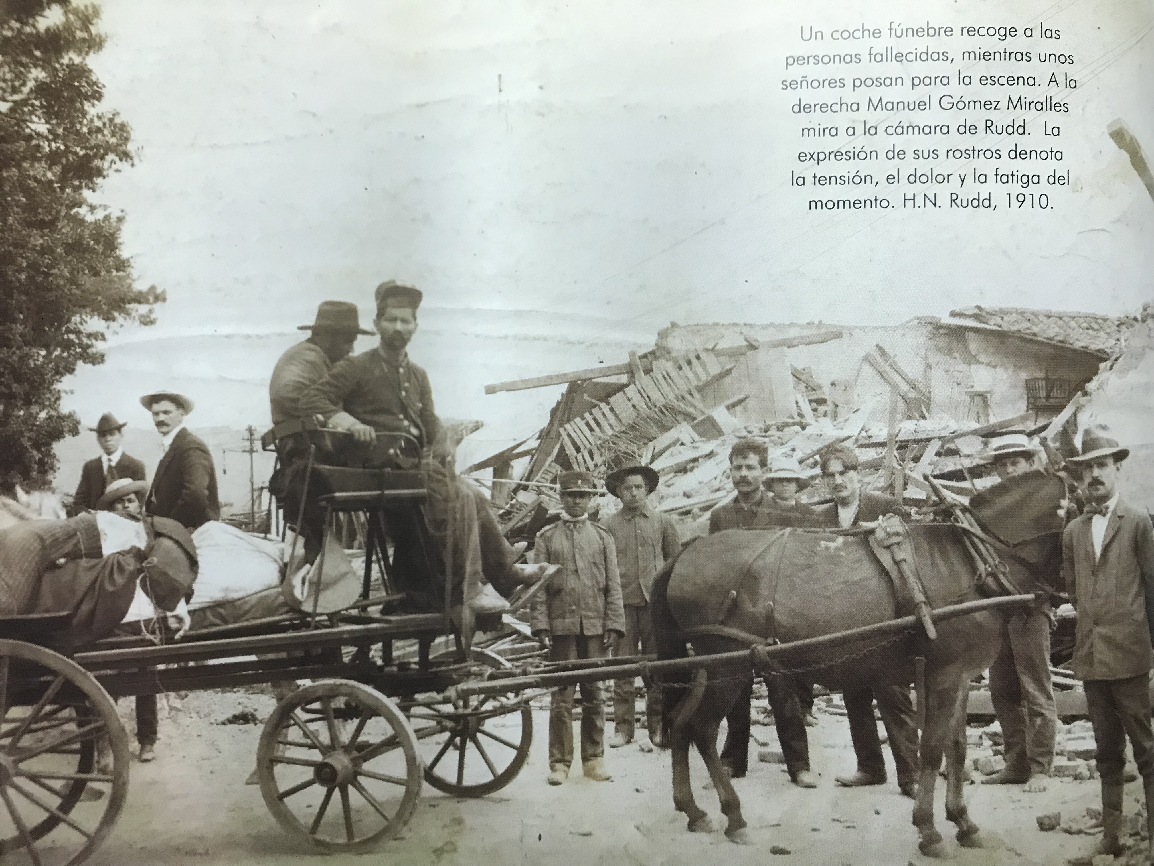IMG_2718 22 marzo, 2019 4032 × 3024 Terremoto de Santa Mónica, Cartago, 1910…Galería de fotografías. Coche fúnebre recoge a las personas fallecidas. A la derecha Manuel Gómez Miralles mira a la cámara de Rudd. H.N. Rudd, 1910 9.951569 -84.053414