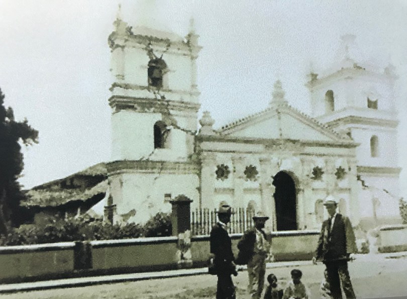 Antigua Basílica de Nuestra Señora de los Angeles después del terremoto. A la derecha Mr. Rudd conversa con dos adultos y dos niños de la localidad. La fotografia fue tomada posiblemente por su ayudante, Gómez Miralles. Siendo una de sus primeras fotografías. Rudd, 1910