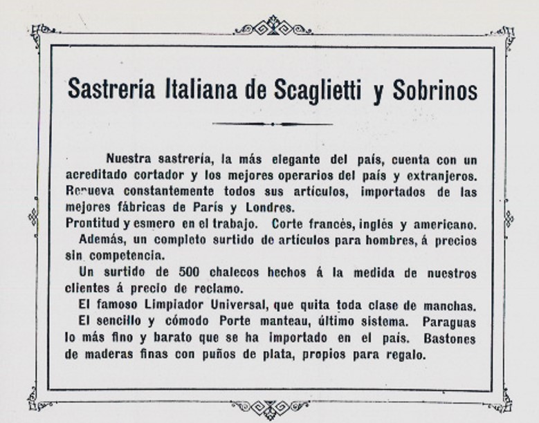 En 1888 fundó la sastrería italiana, que con el correr del tiempo se convirtió en la Sastrería Scaglietti. En 1906, su fundador decidió regresar a Italia, pero dejó la empresa a manos de sus sobrinos: Felice, Ugo y Mario.