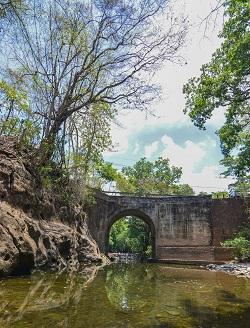 Tipo de Material del Puente: Es de Arco circular formado por bloques de piedra en forma de cuna de 0.5 m por 0.20 m. La luz del arco es de 10.1 m y el ancho de 7.3 m.