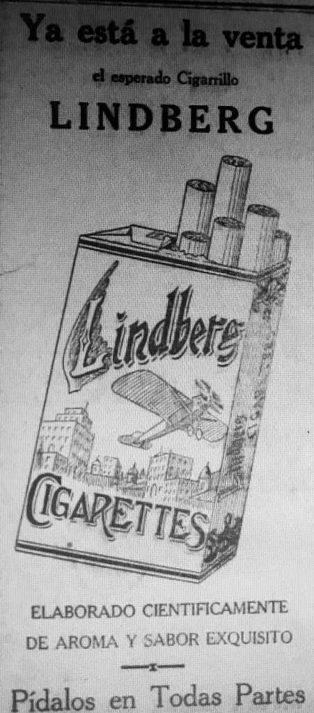 O este otro que dice: “Lindbergh brindará aquí con kolas de La Gaviota.» Pero quizá el mejor es que afirma que ya están a la venta los esperados cigarrillos Lindbergh. Pero parece que Lindbergh no fumaba, tampoco tomaba y no sabía bailar.