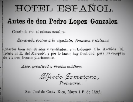 Con ese anuncio, publicado en el diario La República el 7 de diciembre de 1892, se informaba al público costarricense de la apertura del Hotel de Europa, ubicado en la calle Central de San José. El dueño, G. Sacripanti, no dudaba en calificar al hotel de decentísimo, cómodo, amplio, provisto de una gran cantina, doble comedor y cuartos de segundo piso.