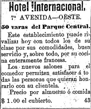 Dentro de la oferta culinaria, no faltaba la cocina francesa del Hotel Internacional, propiedad de C. Giuliani (La Prensa Libre, 20/10/1891); del Hotel Estrella del Norte y del Hotel Roma (El Heraldo, 28/02/1891).