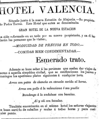 Otros lugares, como El Hotel Valencia, promovían la venta de comidas bien condimentadas y, en días especiales, la elaboración de arroz a la valenciana, mondongo a la andaluza con bacalao, y bacalao con alioli (ajos machacados con aceite) (La Prensa Libre, 04/09/1892).