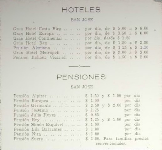 A continuación encontrará algunos de los primeros hoteles que hubieron en Costa Rica, sobre todo en la capital de San José. Solamente dé clic en el hotel que desea ver su información.