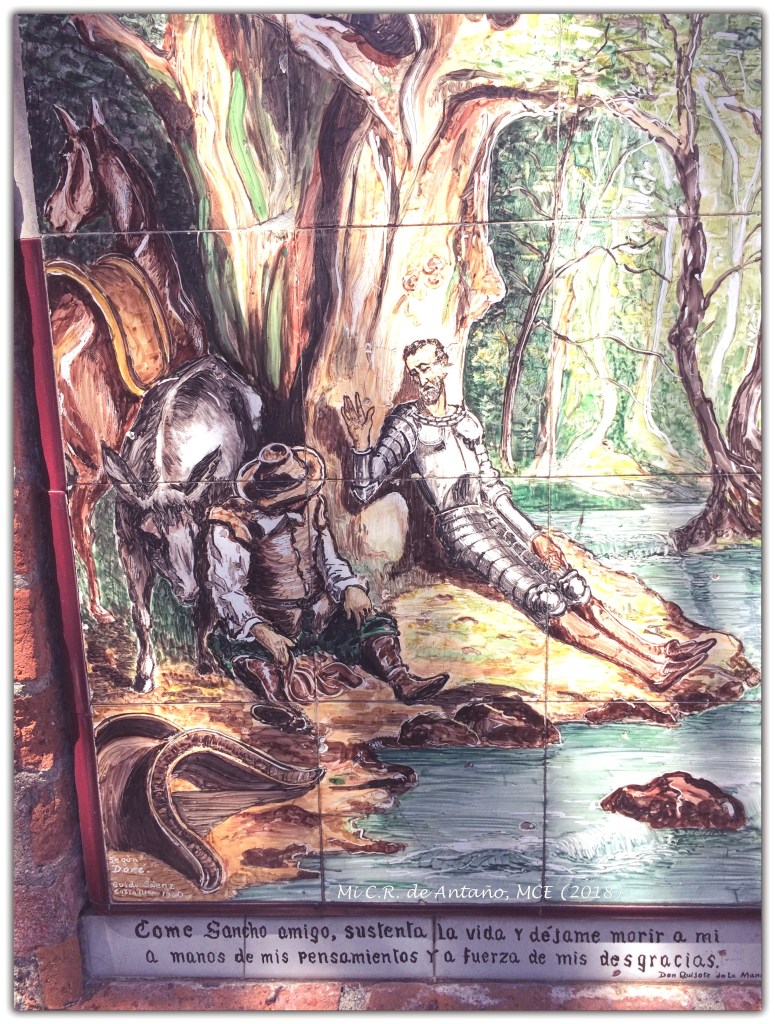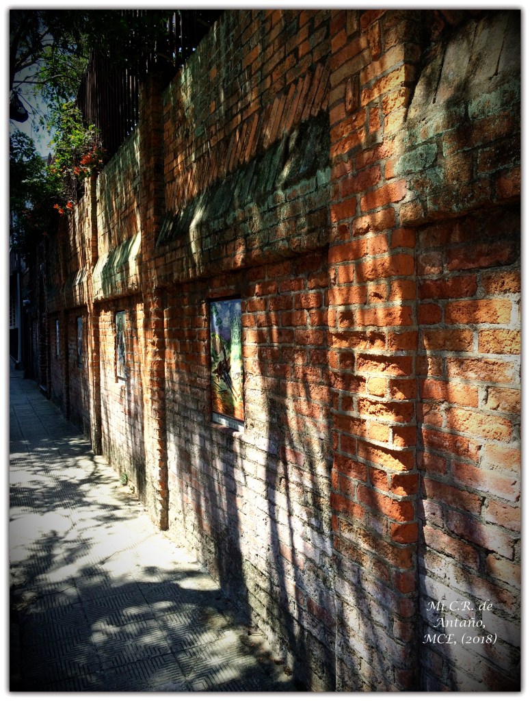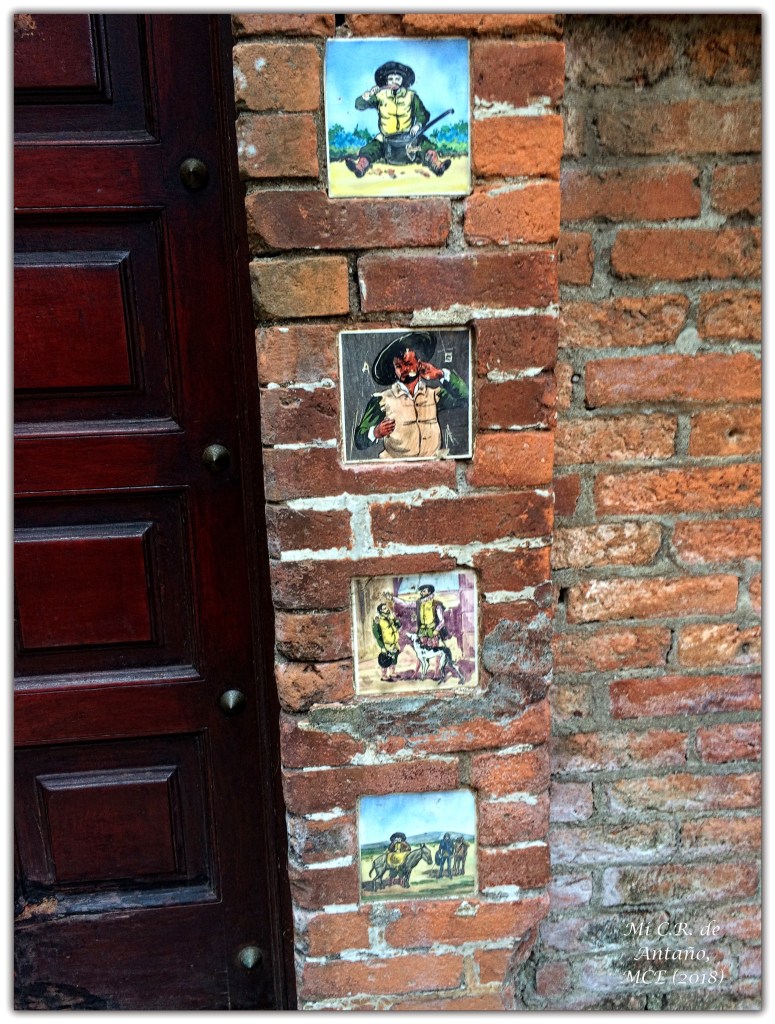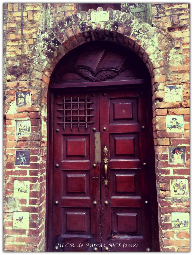 La vivienda está protegida por un muro de ladrillo expuesto, en el que se encuentran mosaicos pintados con distintos pasajes del Quijote, hechas por Guido Sáenz González. El acceso es en forma de arco, con puerta de doble hoja pintada de color café oscuro, en una de las cuales hay una ventanilla protegida por una reja. Presenta en su parte superior el diseño en madera de un libro con la leyenda, “Don Quijote de la Mancha, libro cumbre del idioma, y la más alta creación literaria, de la humana inteligencia, 1965”. Encima tiene un farol y a sus lados pequeños mosaicos que continúan la temática de las pinturas atrás mencionadas. Una fila de molduras, perpendiculares a un conjunto de pilastras efectuadas a partir del mismo ladrillo, complementan el diseño de la entrada, adquiriendo similitudes con las características de la arquitectura hispano-cristiana medieval. El muro remata con una verja en su parte superior, al parecer instalada hace no muchos años, en la cual ha surgido una enredadera. El material provino de la ladrillera familiar.