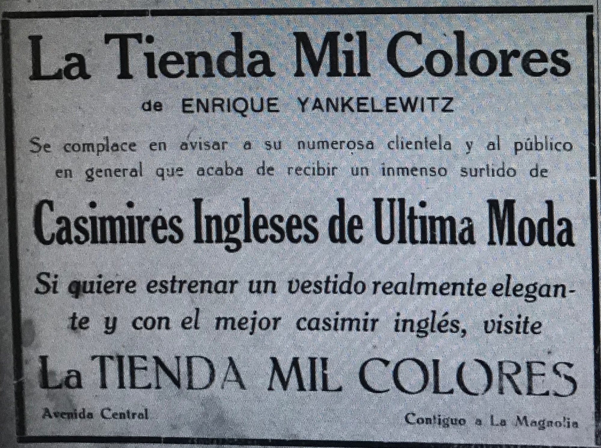 La Tienda Mil Colores del señor Enrique Yankelewitz, judío residente en nuestro país se ubicaba sobre Avenida Central, contiguo a La Magnolia.