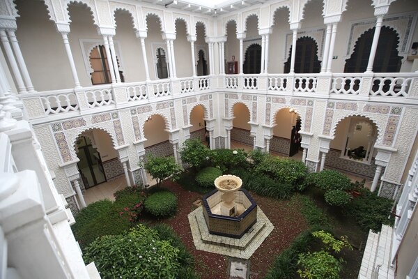 Las paredes que sirven de marco al pasillo que rodea el patio están enchapadas en finos azulejos con motivos arabescos que presentan vivos colores: naranja, negro, azul, dando un abierto contraste con las paredes blancas que predominan en el edificio.