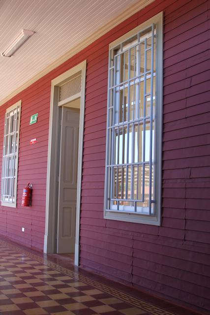 Las paredes externas son de hierro galvanizado imitación tablilla con un pequeño zócalo de ladrillo de unos 30 cms de alto. En la pared de la fachada principal se observan cuatro ventanales grandes a cada lado de la puerta principal, son de tipo guillotina con ocho cristales de unos 30 x 20 cms. El ventanal que da a la dirección de la escuela posee una sencilla verja de protección.