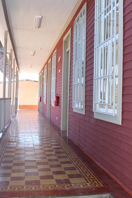 En los laterales de la edificación no existen ventanas. En la parte posterior se aprecia un corredor cubierto a todo lo largo del inmueble, sustentado por seis columnas sencillas de madera. Este corredor da a un amplio patio cementado y a las nuevas ampliaciones de la planta física. En los dos extremos del corredor se instalaron jardineras en block, no originales, que están en abandono.