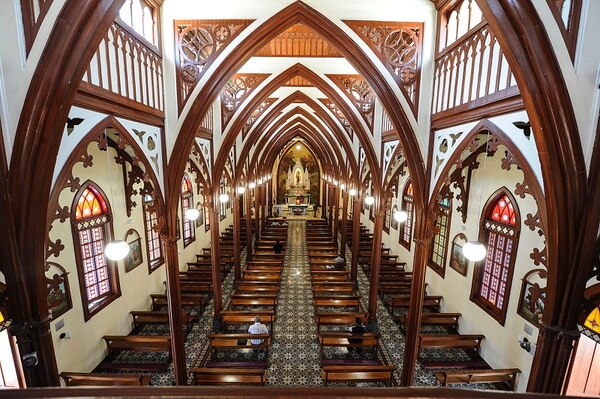 La fachada y el interior inspirados en el estilo neogótico, son más elementos decorativos que corriente arquitectónica regional: arcos ojivales, pináculos y parapetos almenados, son simplemente elementos agregados, inspirados en una visión sentimental de las grandes catedrales europeas y en el trabajo artesanal.