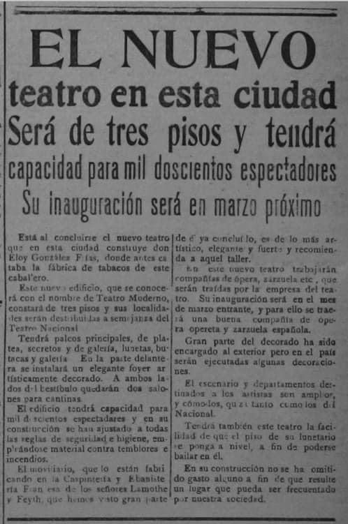 “Con planos del ingeniero don Luis Llach, se está construyendo en San José un nuevo teatro en el mismo lugar en que estuvo el ‘Olympia’ […]. El nuevo teatro se llamará ‘Teatro Moderno’, será mucho más cómodo y más grande que el ‘Variedades’ y tendrá todos los adelantos modernos. Este edificio será orgullo de la ciudad capital […]. Números de ‘varietés’ están contratados ya por el señor Rafael Delcore en Europa”.