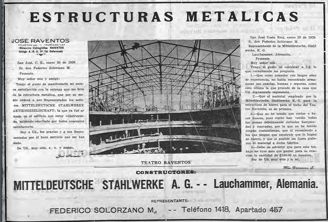El terreno fue comprado por el español José Raventós, quien con el sueño de poder reproducir zarzuelas y operetas, se decide utilizar el mismo para la construcción del actual teatro. José Fabio Garnier Ugalde, Dramaturgo y arquitecto, diseña el teatro. La construcción se da el 8 de febrero de 1927; para concluir con la inauguración el 7 de octubre de 1928 con la representación de la Compañía de Operetas de Esperanza Iris.