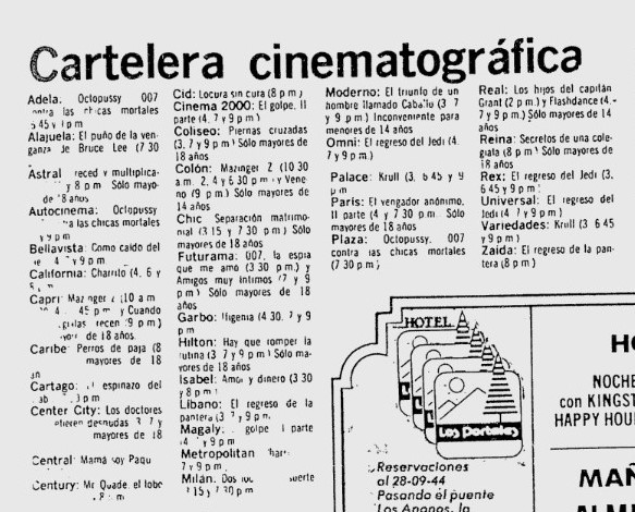 Nota curiosa es que en ese mismo año 1983 los anuncios de las carteleras cambian su presentanción en los periódicos a una lista de Cartelera Cinematográfica como la que vemos en la publicación anterior de La Nación.