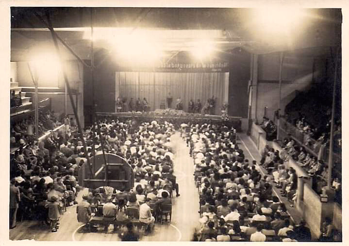 Como podemos ver en esta fotografía la sala era bastante grande con graderías en sus dos costados y un amplio salón al centro con un escenario alto y de buen tamaño para las exhibiciones que se llevaban a cabo.
