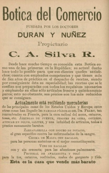 La Botica del Comercio fue fundada en 1874 por los doctores Durán y Núñez y su propietario fue C.A. Silva R.