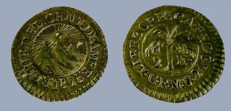 Mientras tanto, entre 1822 y 1825, continuaron circulando las monedas del imperio español y las de otros estados de América. La casa de moneda provisional, establecida en 1824, produjo monedas de oro a partir de 1825, en denominaciones de una onza, media onza, dos escudos, un escudo y medio escudo, y estuvo a cargo de un minero español llamado Mateo Urandurraga, quien fungió como ensayador, motivo por el cual sus iniciales aparecen en las monedas.