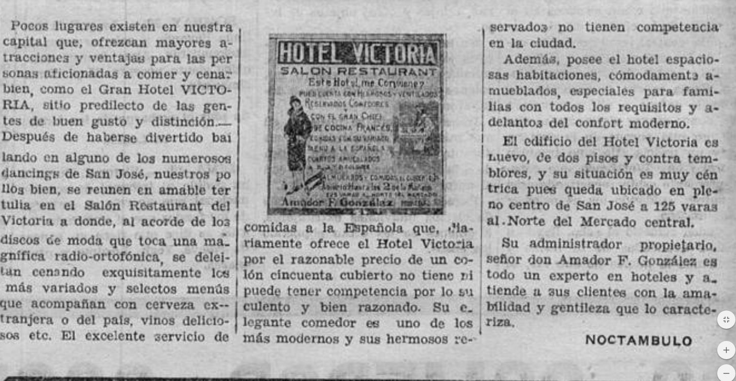 El Hotel Victoria se caracterizaba por su Salón Restaurante que ofrecía a sus clientes además de música de moda que tocaba una radio-ortofónica, deliciosos platillos variados y selectos acompañados con cerveza extranjera o del país, vinos deliciosos, etc. El costo de de la cena era de un colón cincuenta.