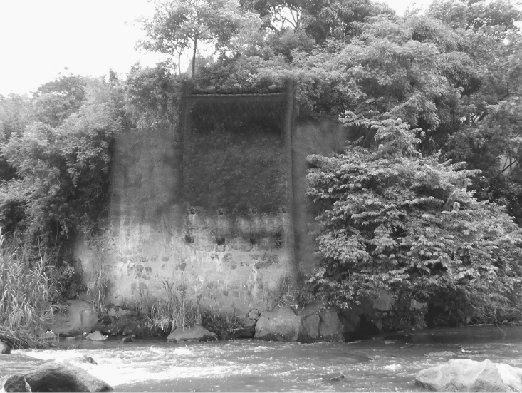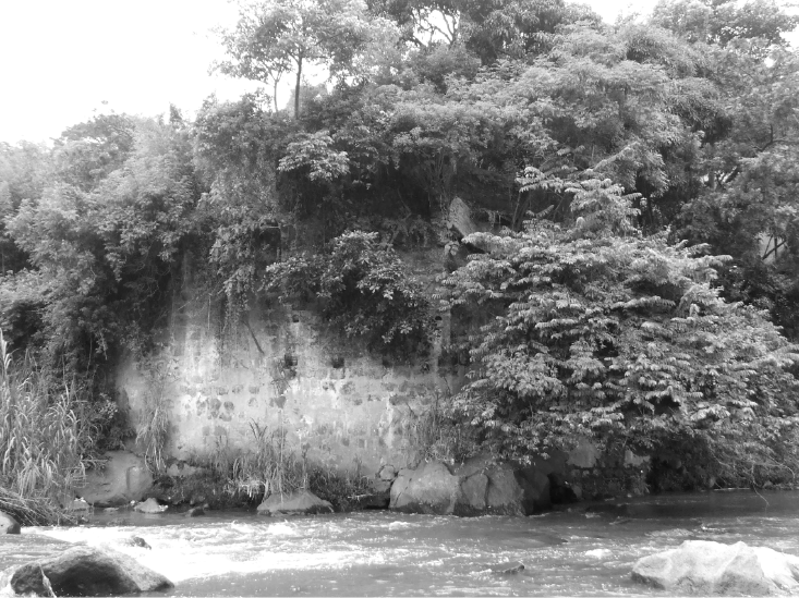 La fotografía 4 muestra el estado actual del bastión sur –la imagen fue tomada desde la margen norte–. En esta vista en que se ha eliminado la vegetación que cubre el bastión, se observa que los restos del arco si fueron eliminados, quedando como una mole de piedra, argamasa y cemento de 12 metros de altura, o sea, la equivalente a un edificio de cuatro pisos.