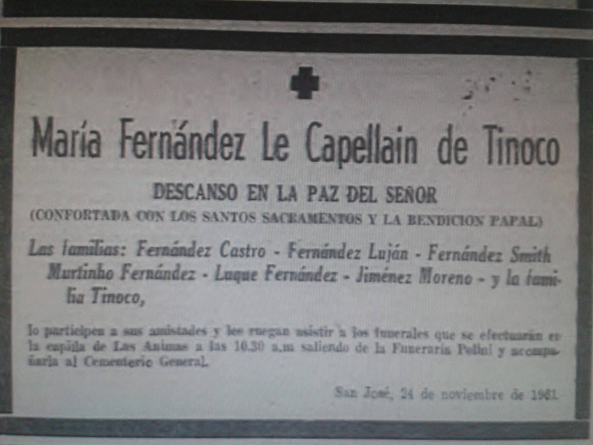 Doña María Fernández de Tinoco murió en San José, el 23 de noviembre de 1961, a los ochenta y cuatro años de edad.