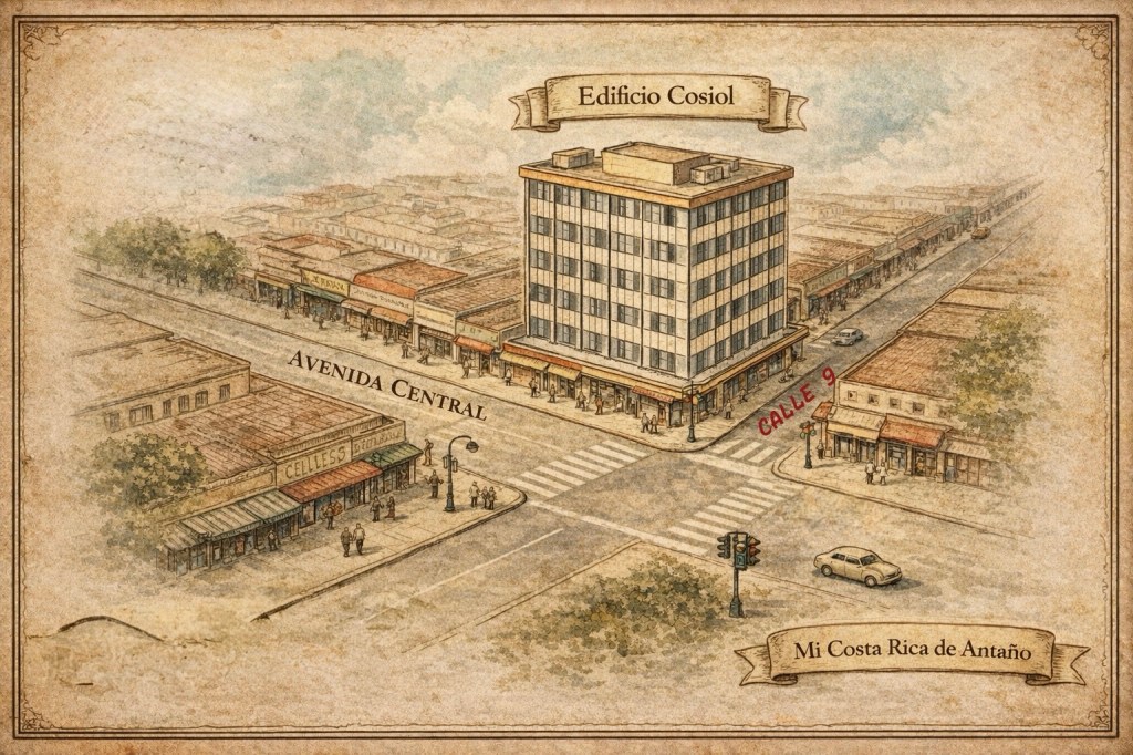 En la esquina de la Avenida Central con Calle 9 se levanta aún hoy el antiguo Edificio Cosiol.