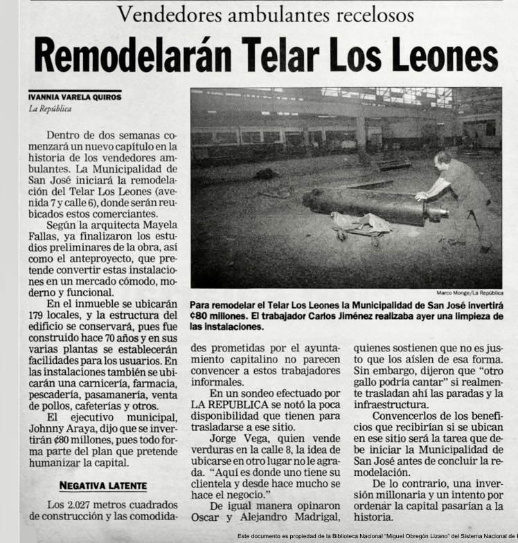 Los vendedores ambulantes serían reubicados en el edificio Telar los Leones, siendo este transformado en un mercado. 21 de mayo de 1996. Periódico La República, Ivannia Varela.