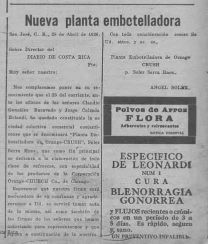 Este documento constituye una de las primeras evidencias claras de la producción local de refrescos Orange Crush en Costa Rica.