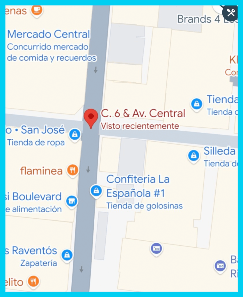 Ubicada en una esquina estratégica del corazón josefino, frente a la esquina Sur-este del Mercado Central de San José, diagonal al Edificio Raventós. Esquina de avenida central y calle 6 esquina Oeste de La Gloria