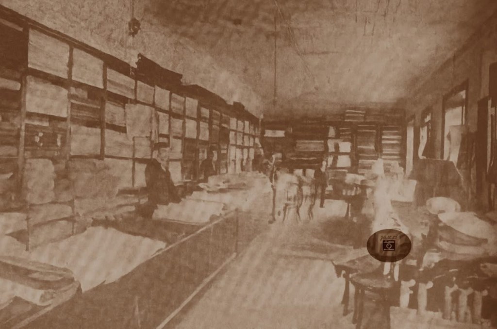 El interior revela una tienda especializada en textiles, con largos mostradores de madera y telas organizadas cuidadosamente.