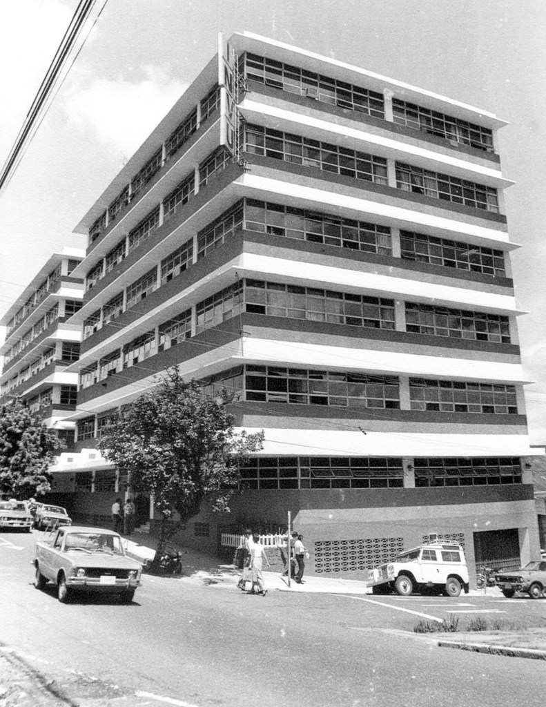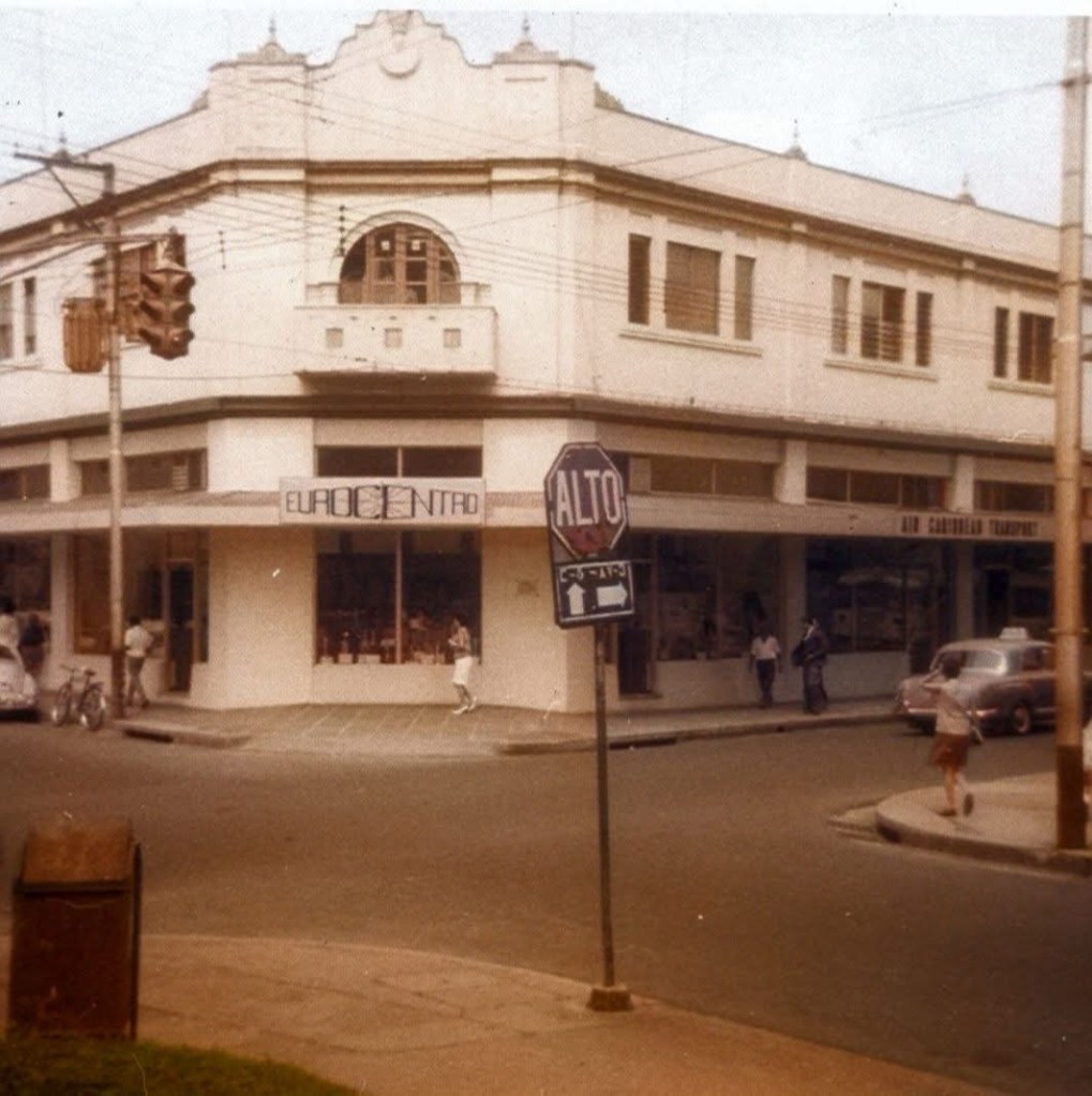 Esquina suroeste de la manzana del Banco Central. En el fondo el edificio que precedió al actual Edificio de la Artillería. En este edificio estuvo la primera sucursal de la Agencia Datsun luego que se trasladara a la Sabana. También estuvo en ese edificio RILASA y Radio Libertado además de otros negocios.