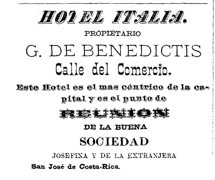 Habitaciones espaciosas, limpias y amuebladas para familias y caballeros. Muy buena mesa y barata. Un empleado de la casa estará a en la Estación a todas las llegadas de trenes. English Spoken. Propietaria María v. de Alvarado. Dirección: Calle de la Estación, 50 varas al oeste del parque Morazán, San José.