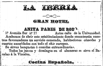 En anuncio del 28 de abril de 1891 anuncian su reciente apertura. Ofrecen servicio esmerado, habitaciones cómodas y cuartos amueblados con todo el chic europeo. Se destacan por sus banquetes extraordinarios. Los días jueves y domingos en el almuerzo se sirve el Bacalao a la Vizcaína. Preferencia, cocina española.