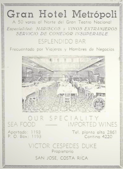 Este hotel se ubicaba en Avenida Segunda, 50 metros Norte del Teatro Nacional. Su especialidad era Mariscos y vinos extranjeros. Frecuentado por viajeros y hombres de negocios. Su propietario Víctor Céspedes Duke.